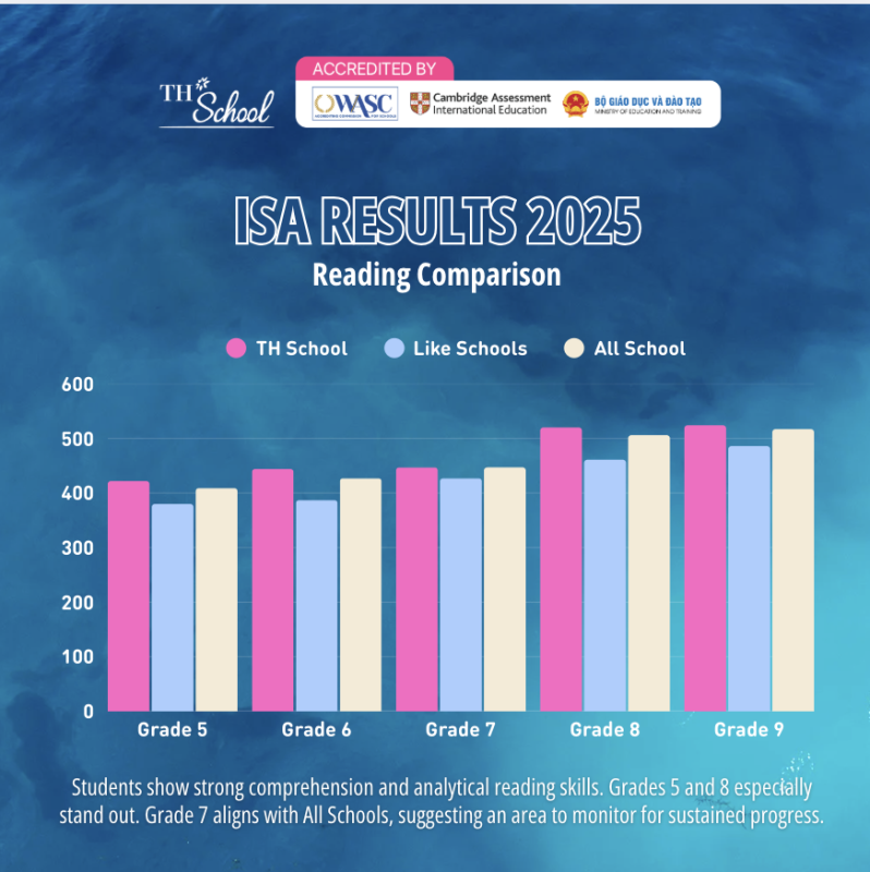 Trong kỳ ISA 2025, học sinh TH School từ Khối 5 – 9 đã đạt được những kết quả cao và ổn định ở cả hai lĩnh vực. Điểm trung bình Đọc hiểu và Toán học phần lớn vượt nhóm các trường tương tự và cao hơn mặt bằng chung quốc tế, trong đó Khối 9 ghi nhận nhiều bứt phá nổi bật trong lĩnh vực Toán học còn khối 5 và 8 vượt trội trong lĩnh vực Đọc hiểu. Điều này cho thấy các em học sinh TH School, với phương pháp dạy và học tiên tiến, hiện đại đã đạt được khả năng tư duy, phân tích và vận dụng linh hoạt kiến thức vào thực tiễn, là minh chứng rõ ràng và thuyết phục cho chất lượng giáo dục đạt tiêu chuẩn quốc tế.