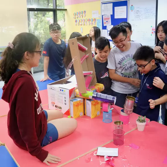 As part of STEM Week, students demonstrated their inventiveness in the TH Machine Contest. Students in Grades 6, 7 and 8 were allocated to groups of 3-6 members to design and assemble a machine with at least 15 components