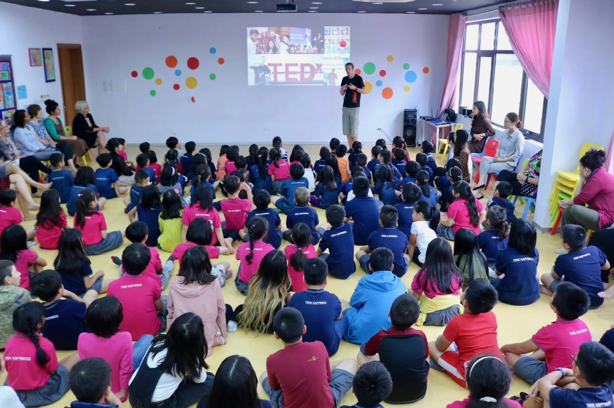 In the Sports Hall at the Chùa Bộc campus, d’Arcy gave presentations to primary and secondary students on the importance of not only acquiring knowledge in school but also learning and living ethical values. During the sessions, students listened attentively to his presentation advocating for globally minded citizenship and how to be a good ‘global citizen.’